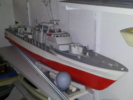 Was man auf dem Foto nur ahnen kann sind die vielen Beulen, die dieser Rumpf hat. Jetzt liegt ein Ersatzrumpf parat. Eine der Beulen kann man knapp unterhalb der vorderen Brückenkante sehen. Bin mal gespannt, ob und wie ich den Umbau vom alten in den neuen Rumpf hinbekomme. Gleichzeitig möchte ich dann von der graupnerschen Lösung mit drei Wellen hin zur originalen Konfiguration mit vier Wellen umbauen. Aber nur bei diesem Boot hier. Das andere Boot behält seine drei Wellen und Ruder.